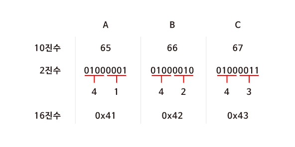 - 0 ~ 9 / A ~ F : 총 16개로 16진수를 표현 가능(F = 15)