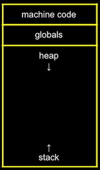 머신 코드(Machine Code) 영역: 프로그램이 실행될 때 프로그램이 컴파일된 바이너리 파일 저장됨글로벌(Globals) 영역: 프로그램 안에서 저장된 전역 변수가 저장됨힙(Heap) 영역: malloc에 의해 동적으로 할당된 메모리 데이터가 저장됨스택(Stack) 영역: 프로그램 내의 함수 호출시 생성되는 변수나 지역변수들이 저장됨