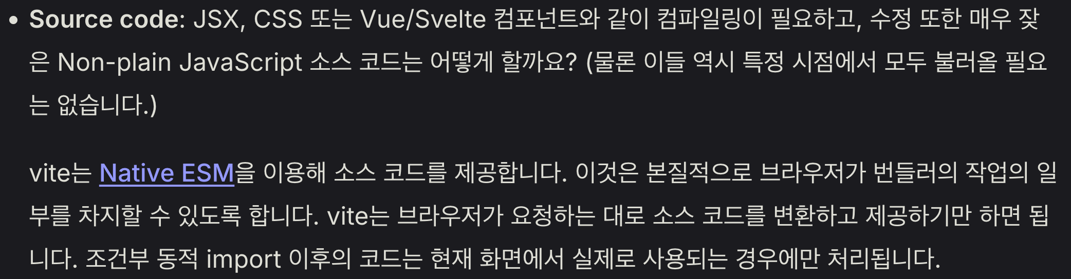 Vite는 소스 코드를 Native ESM을 이용해 필요한 순간에 로드하기 때문에, 특정 파일을 수정할 때 전체 프로젝트를 다시 번들링할 필요가 없다.