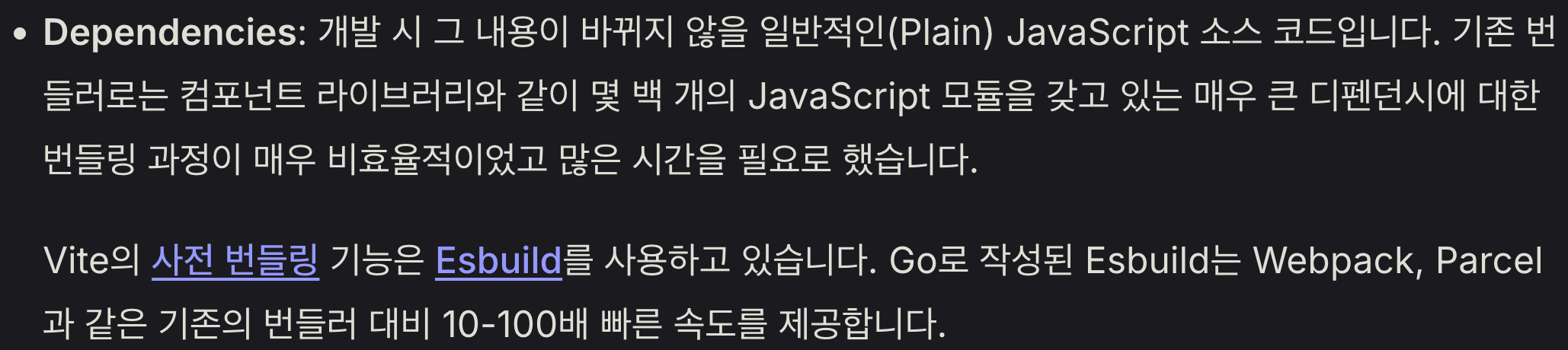 Vite는 사전 번들링 기능은 개발 시 변경되지 않을 JS 코드들을 Esbuild를 통해 사전 번들링한 후, 이후 개발 서버를 실행할 때는 사전 번들링된 정적인 코드만을 활용한다.
