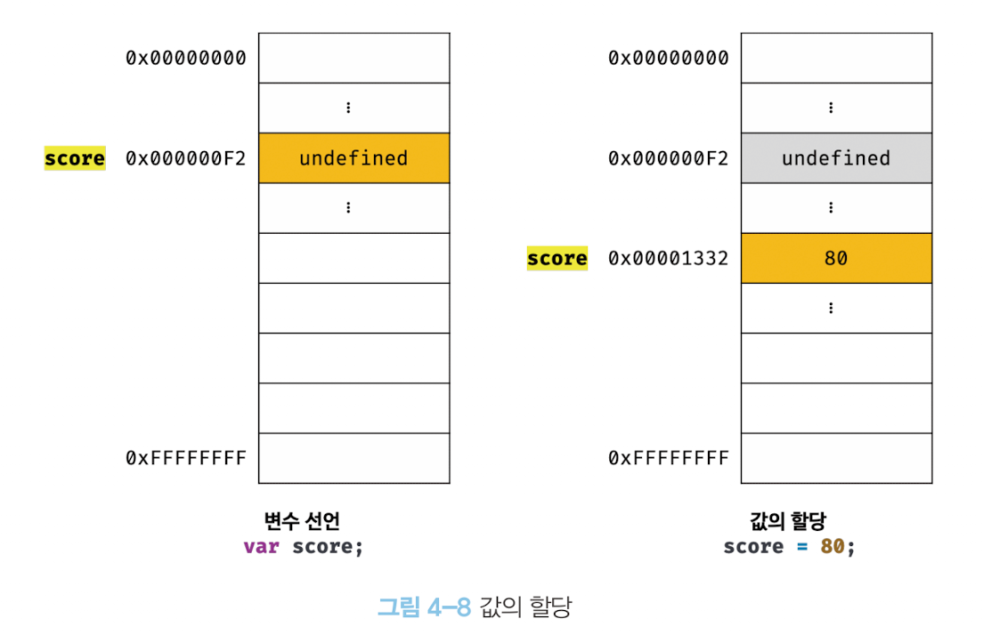 // 2. score = 80;에서 값을 할당할 때 undefined 주소가 아닌 임의의 주소 공간에 80을 할당한다.
