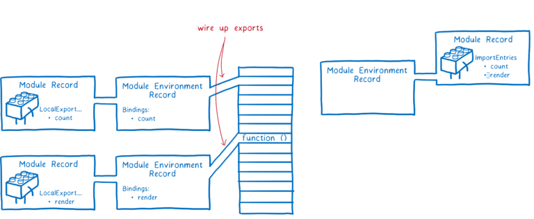 - 메모리 할당: 각 모듈 레코드에 해당하는 메모리 공간을 할당합니다. 이때 export된 값을 저장할 공간도 함께 할당됩니다.