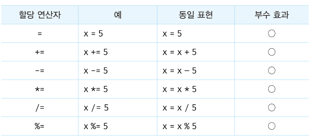 할당 연산자는 우항에 있는 피연산자의 평가 결과를 좌항에 있는 변수에 할당한다. 좌항의 변수에 값을 할당하기 때문에 변수 값이 변하는 부수 효과가 있다.