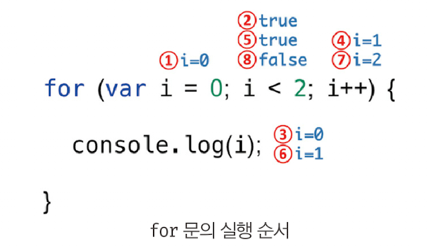 - 변수 선언문 `var i = 0` 이 먼저 실행된다. 변수 선언문은 단 한 번만 실행된다.