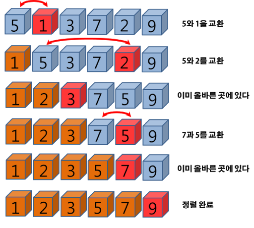 배열에서 최소값을 찾아 이 최소값을 배열의 첫 번째 요소와 교환하고 그 다음에는 첫 번째 요소를 제외한 나머지 요소들 중에서 가장 작은 값을 선택하여 두 번째 요소와 교환한다. 이 과정을 (배열의 크기-1) 만큼 반복하여 배열이 모두 정렬될 때까지 반복하는 정렬