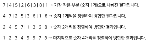 원소가 한 개가 될 때까지 계속해서 반으로 나누다가 다시 합치면서 정렬하는 방법